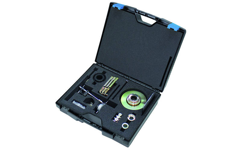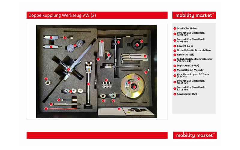 Für eine fachgerechte Instandsetzung an Doppelkupplungssystemen sind geeignete Spezialwerkzeuge unbedingt erforderlich, um kostspielige Schäden im voraus zu vermeiden. Der Doppelkupplungs-Basiswerkzeugsatz inkl. dem VW spezifischen Ergänzungssatz ermöglicht die fachgerechte Instandsetzung von allen derzeit verfügbaren VW Doppelkupplungssystemen (trockene Kupplungsausführung). Passend für VW-Audi, Seat und Škoda mit trockenen Doppelkupplungssystemen, z.B. bei DSG-Getrieben der 1.-Generation 0AM (bis 5/2011) und 2.-Generation 0CW (ab 6/2011).