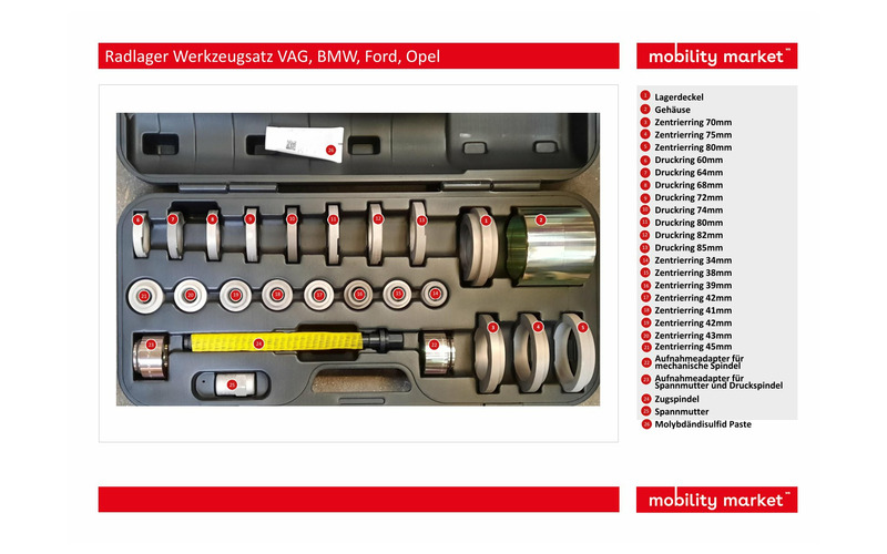 Zum schnellen, sicheren und fachgerechten Aus- und Einbau von Radlagern. Die besondere Konstruktion der Druckscheiben gewährleistet eine sichere und genaue Zentrierung beim Radlagerwechsel, sowie dass beim Aus- und Einbau des Radlagers nur auf den Lageraußenring und beim Einbau der Radnabe nur auf den Lagerinnenring gedrückt wird. Dies verhindert eine Beschädigung des neuen Radlagers. Durch die Kombination von Zentrier- und Druckringen ergeben sich Druckstücke, die präzise auf die Lager-Ø abgestimmt werden können. Bei sehr festsitzenden oder eingerosteten Radlagern kann optional auch ein hydraulischer 17 t Antrieb eingesetzt werden. Passend für VW-Audi, BMW, Ford, Seat, Škoda, Opel etc.